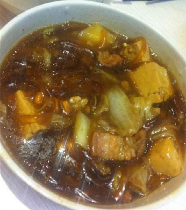 记得吃饭的时候,其他的菜都摆上桌,但是这个炖菜没有端上来,而是每人面前都用一个大海碗盛满菜,自己吃自己的。