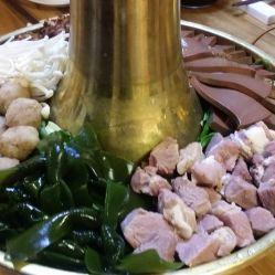 2.炒片好的白菜帮,海带,加高汤,放丸子,豆腐,烧好的肉,根据个人 口味加盐,酱油。