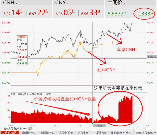 - 中间价对比离岸CNH的即时价格或者在岸的即时价。