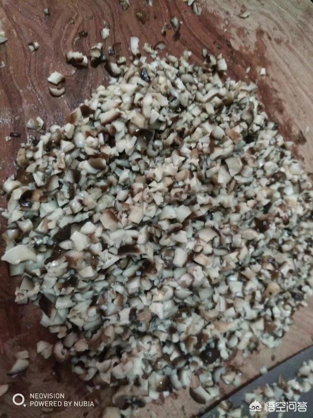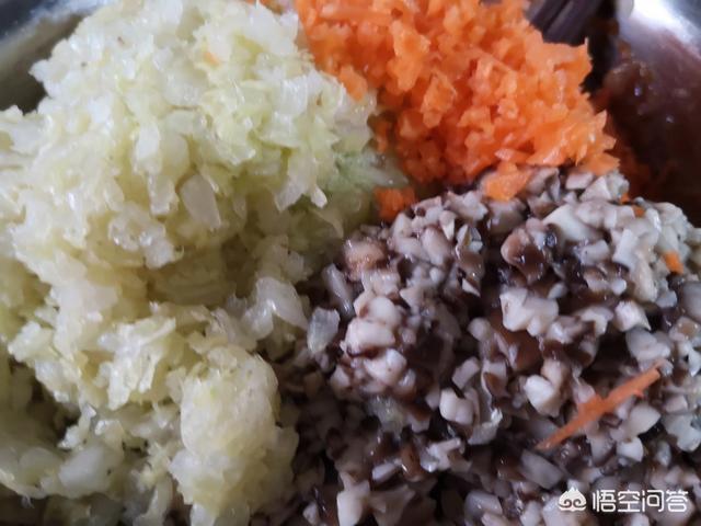 首先要将香菇去蒂,洗净焯水,控干切碎,如果方便的话,可以如果翻炒几下这样的不仅可以是香菇的水分减少,而且有利于包制时比较方便!胡萝卜叉丝切碎,白菜呢,加入盐分腌制15分钟之后洗净控水切碎,