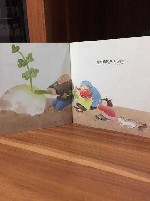 每次文月妈咪给月儿和月儿一起看这本绘本时,会抓着月儿的双手拉拽"嗨呦嗨呦拔萝卜",月儿大笑着一起嗨呦。还有每讲到萝卜拔不出来时,怎么办,文月妈咪会像一休哥那样,两个食指放头顶转圈说"动动脑筋,想想办法",月儿此时也会一起做动作,并也说"动动脑筋,想想办法"。最后,大萝卜拔出来后,大家喝萝卜汤,月儿每看到这页时,也会假装端碗喝汤,还自己配音"mia mia"。