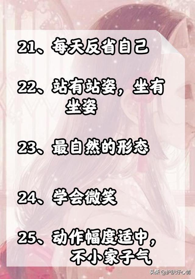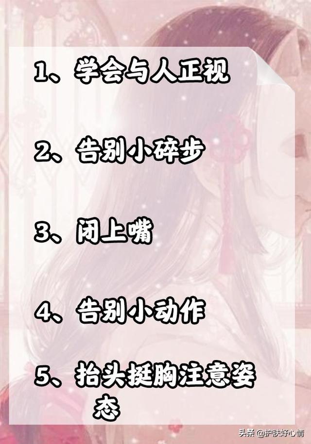 气质这种东西,说不清道不明,但是可以通过后天的练习去拥有,推荐了练习的25招,可以慢慢的去养成去练习,虽然气质无法用言语去表达,但是却可以让人真实的感受得到,