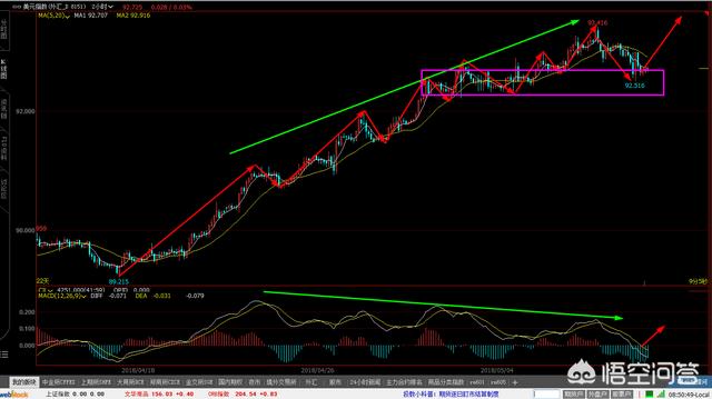 从美元二小时图可以很清晰的看到,周线上涨这一笔内部发生了明显的背离现象,即使美元还能创新高,但要想不背驰的话,最少要在现在的基础上再涨4美元,这种可能有多大,概率很小。