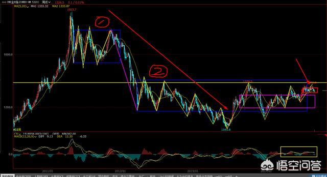 这是黄金的周线图,从周线图上看,周线下跌趋势经历了明显的二个下降中枢,而现在正在构筑上涨趋势的过程中,并且在中枢的上沿构筑了一个小的上涨中枢,从技术分析的角度来看,这都是要上攻的前奏。