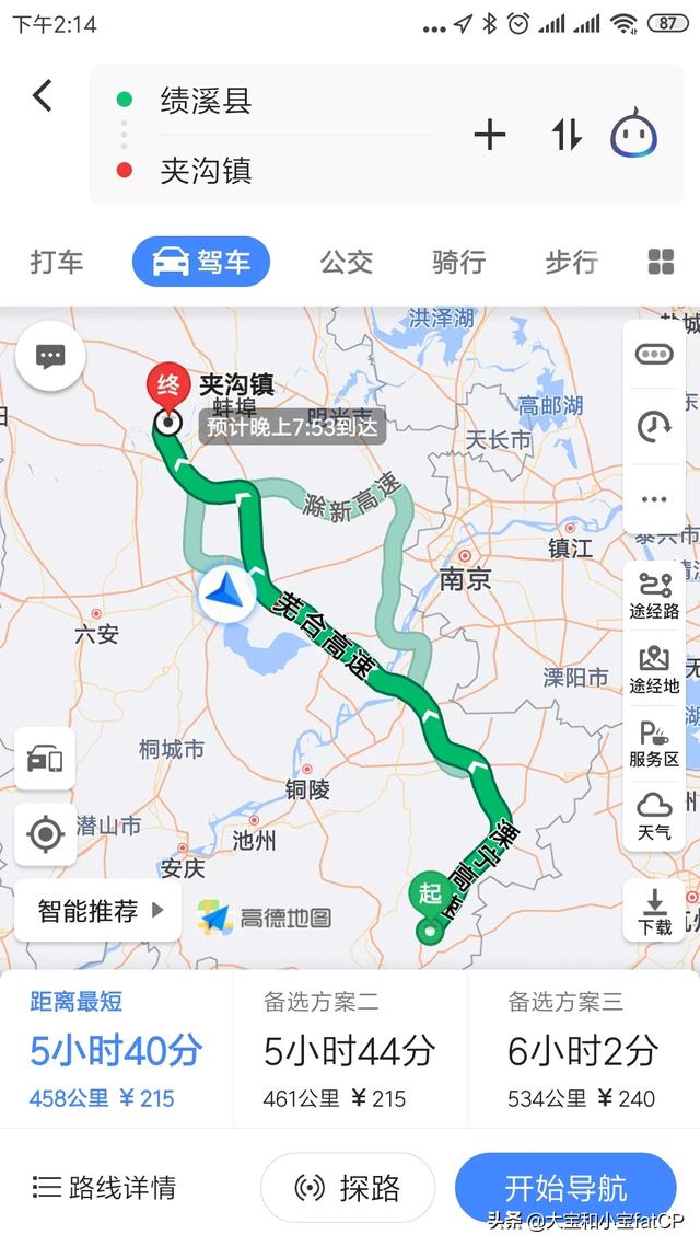 用高德地图,全程接近6个小时,注意不要疲劳驾驶,过了芜湖长江大桥之后到肥东路段有修路,特别特别要注意的就是因为修路很多路段都有低速限速,注意超速。我一个月前从浙江旅游回来就在桥头集弄了个超速100%,当时限速60