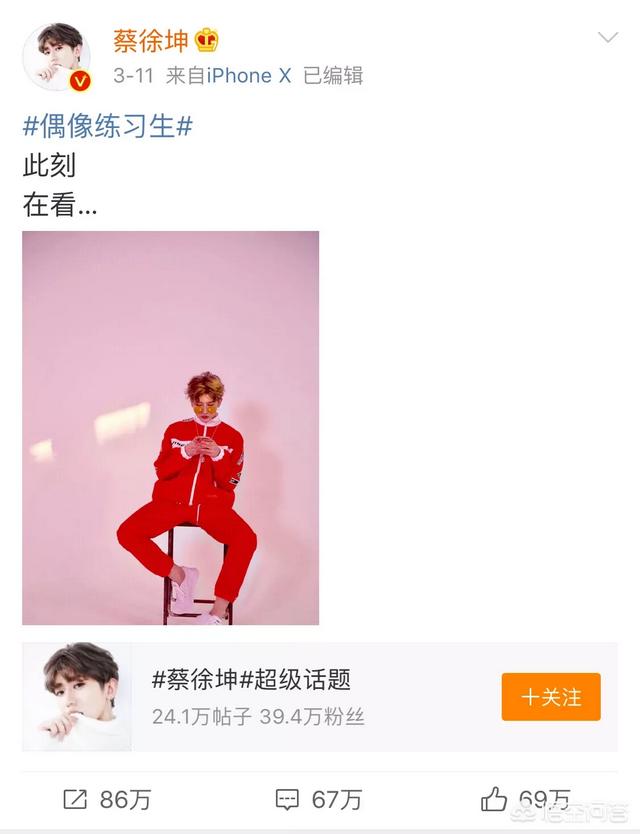 连续几周排名第一的偶像练习生人气选手蔡徐坤的自拍微博转赞评数量是这样的
