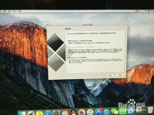 3打开bootcamp助理后,点击继续,进入界面,有三个选项,第一个是 制作win7或更高版本的安装盘(市面上的新款macbook都是win8或更高),第二个选项是 从apple下载Windows支持软件(也就是我们说的驱动,必须安装),第三个 安装win7或更高版本。把三个选项都打上对勾。插上U盘,点击继续。