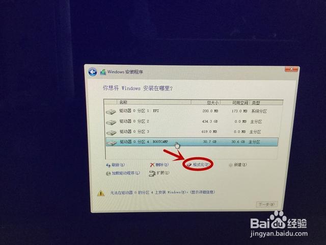 11选择windows安装位置,选择分区4 BOOTCAMP。点击格式化选项。