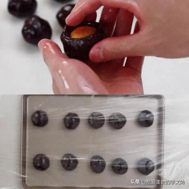 然后把油豆沙分成30克一个的剂子,用手把油豆沙搓成圆球,用大拇指顶出个洞,把处理过的咸蛋黄放进去包好,揉搓成圆剂子,为了防止风干我们要用保鲜膜把分好的剂子盖上。