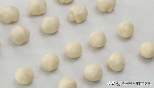 全部揉圆后,再将油酥面团同样分成16份大小均匀的面剂