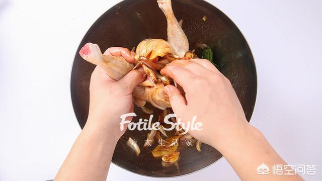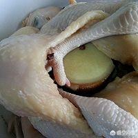 将姜片、香菇以及香葱塞进鸡肚子里。