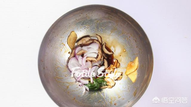 泡好的香菇切碎,洋葱切丝,姜切片,蒜拍碎,葱打结
