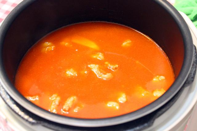 7. 大火煮开后,将锅内的牛肉连汤一起倒入锅内炖50分钟