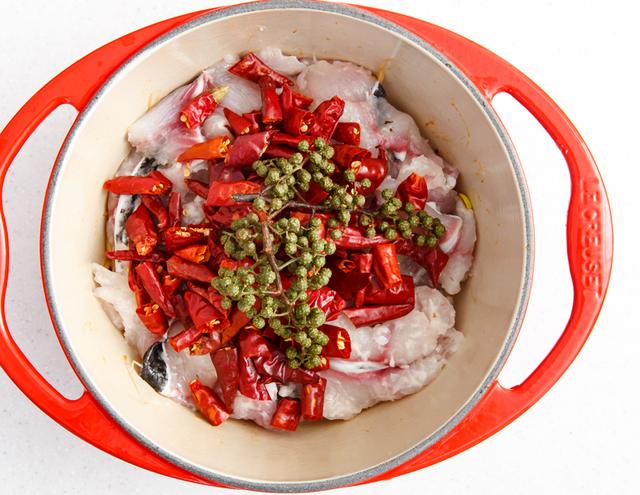 10. 腌制好的鱼片贴放在黄豆芽的上面,鱼片尽量不要堆积在一起尽量散开,放入干辣椒和青花椒