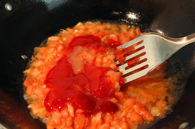 5. 锅中放入少许油,油热后放入葱末煸香,然后放入番茄丁继续煸炒,两分钟后加入番茄酱继续翻炒匀均。