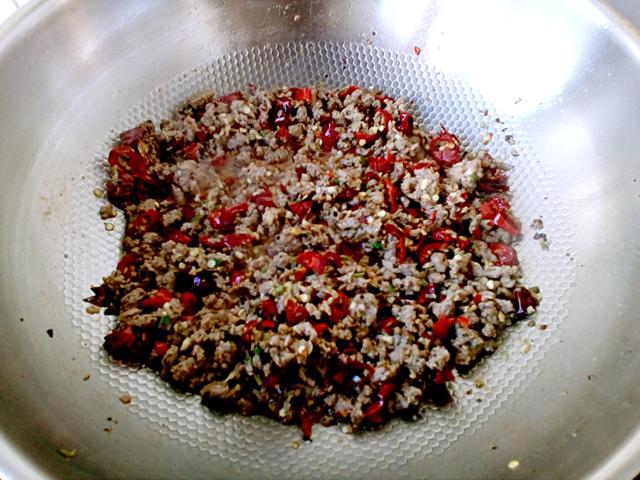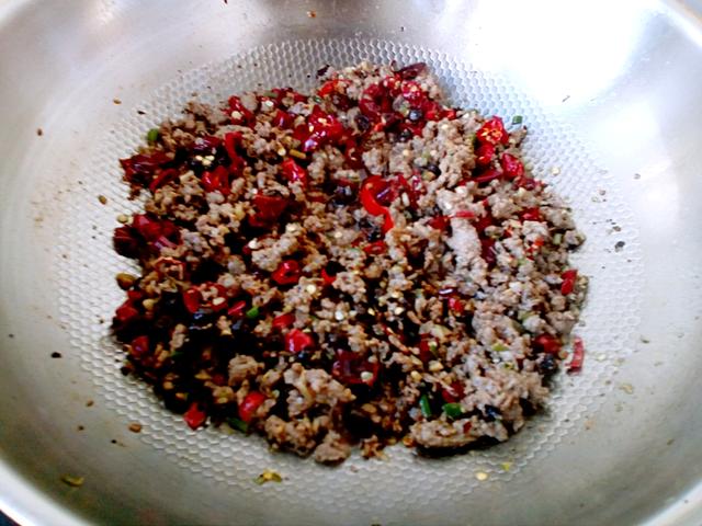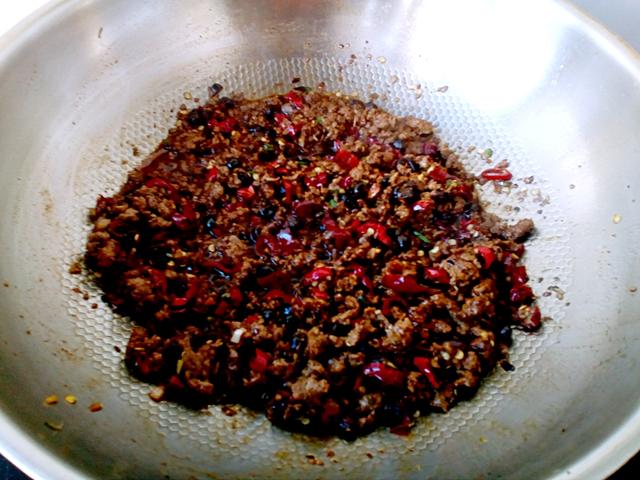 8.锅内加入适量的油和自制油辣子,热至8成时入腌渍的牛肉末煸酥