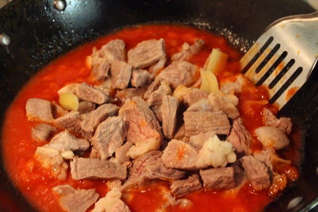 6. 牛肉放入锅内煸炒,接着放入少许白糖翻炒匀均后加入适量的盐,然后加入适量的热水(高汤最佳)。