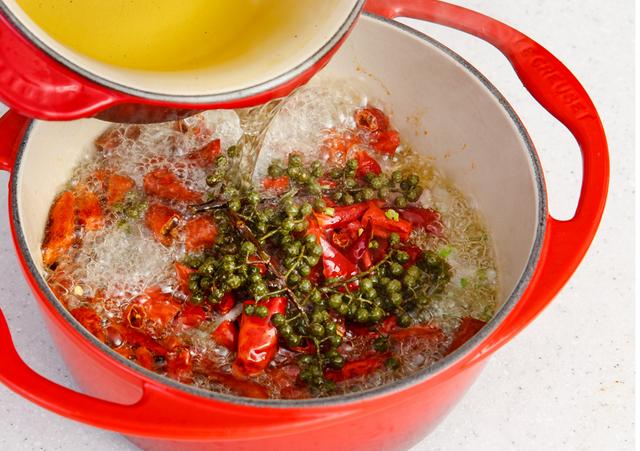 5. 锅内烧热油,放入花椒和八角葱姜,煸炒出香味!