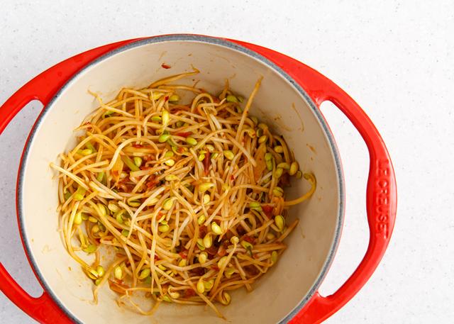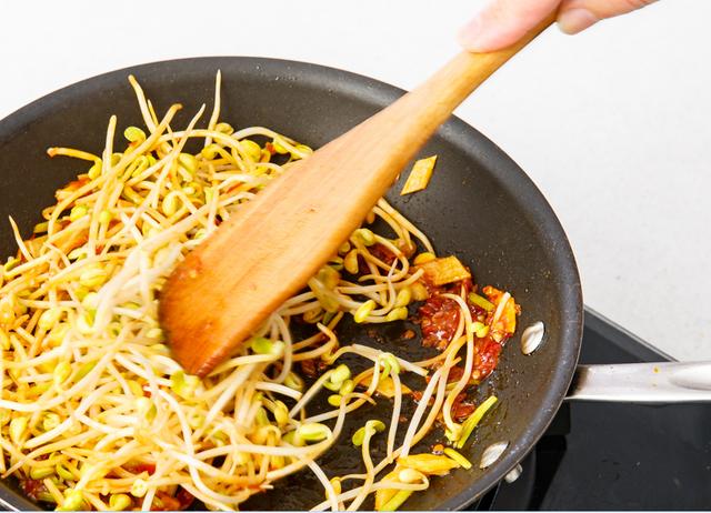 8. 锅中放入2汤匙的植物油,煸炒辣酱酱出红油,倒入黄豆芽,煸熟