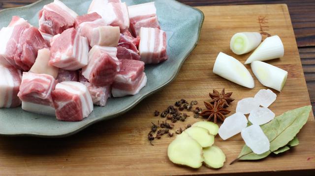 辅料:生抽20克,老抽10克,盐3克,冰糖15克,生姜1块,葱适量,油适量,料酒小半碗,花椒少许,八角少许,香叶2片