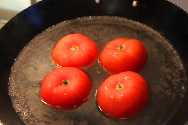 2. 将番茄顶部划十字花刀,然后朝下放入开水中,去皮