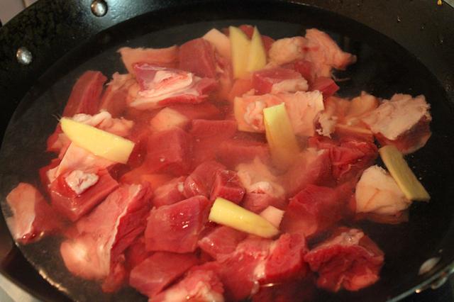 4. 锅中放入冷水,然后放入牛腩、姜片、料酒、白醋煮开后撇去浮沫,牛腩捞出备用