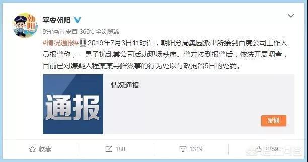 据平安朝阳官方微博消息,2019年7月3日11时许,朝阳分局奥园派出所接到百度公司工作人员报警称,一男子扰乱其公司活动现场秩序。警方接到报警后,依法开展调查,目前已对嫌疑人程某某寻衅滋事的行为处以行政拘留5日的处罚。