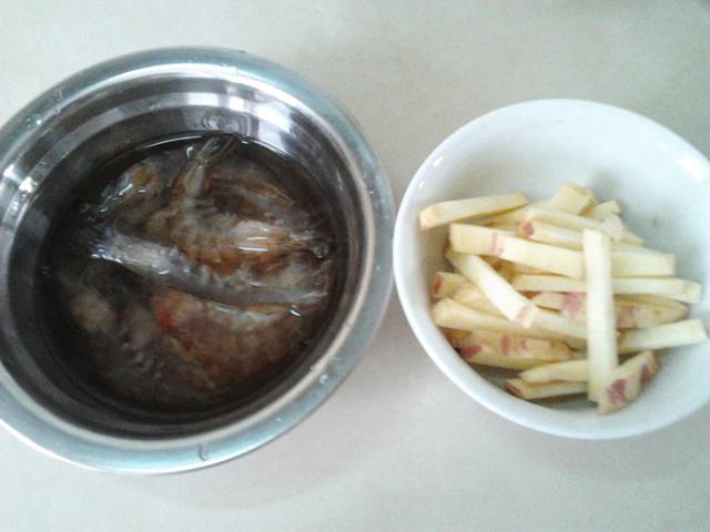 1.明虾剪去虾枪和虾脚,剔除虾线和内脏,红薯削去外皮切粗丝儿