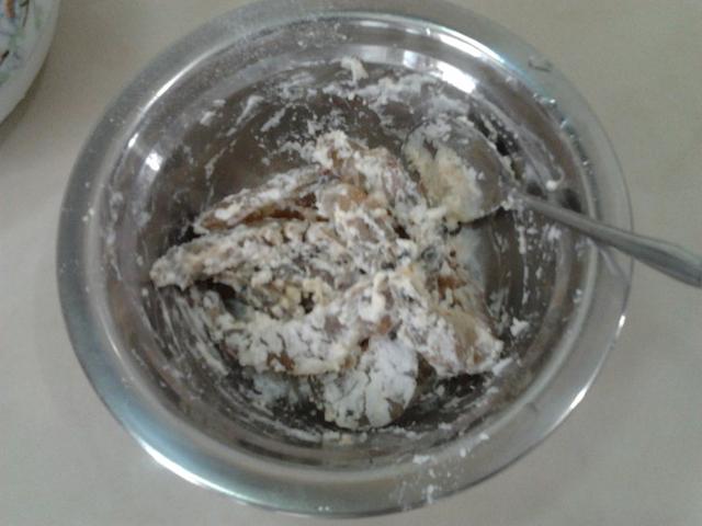 2.把处理好的虾捞出放入玉米粉和糯米粉,少量的盐巴翻搅均匀,让虾身沾满