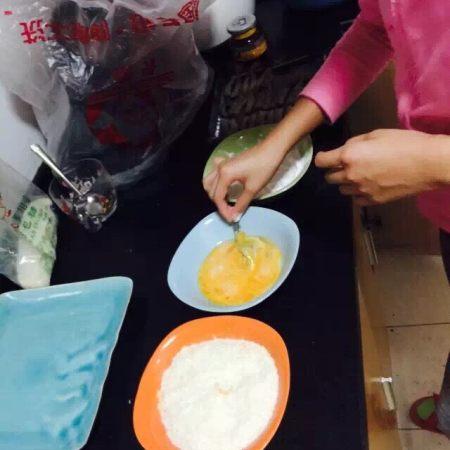 依次沾生粉、鸡蛋液、面包糠