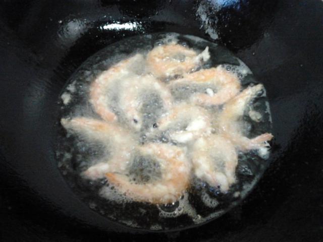 锅里倒入油,大火烧开后转中火,然后开始炸虾,记得一直保持中火,火太大的话,虾炸出来就变成咖啡色了