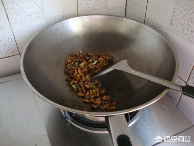 2.炸制脱皮蚕蛹要热锅凉油,一定要注意油温,油温不宜过高,保持在四成热即可,油温过高,炸出的蚕蛹发老发苦。