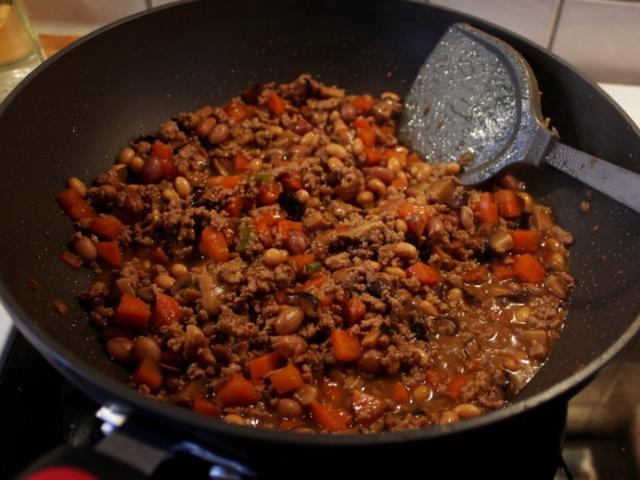 8.盖锅煮至汁水基本收干时,芶点薄芡,让酱更加粘稠起锅。酱较咸,用盐要小心,如没有用胡萝卜,酱里要加点糖调味。胡萝卜和香菇炒一下更加香,如再加点豆腐干味道会更加好。做好的当天拌米饭吃的,第二日又做了几个窝窝头,塞到洞洞里吃得更加香。