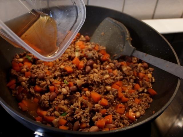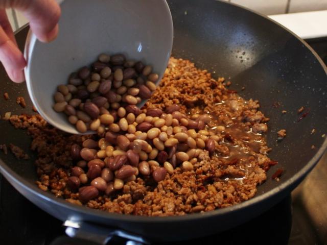 6.酱和肉拌炒均后将煮熟的花生米和黄豆倒入锅中,并且将炒断生的胡萝卜和香菇也下锅。