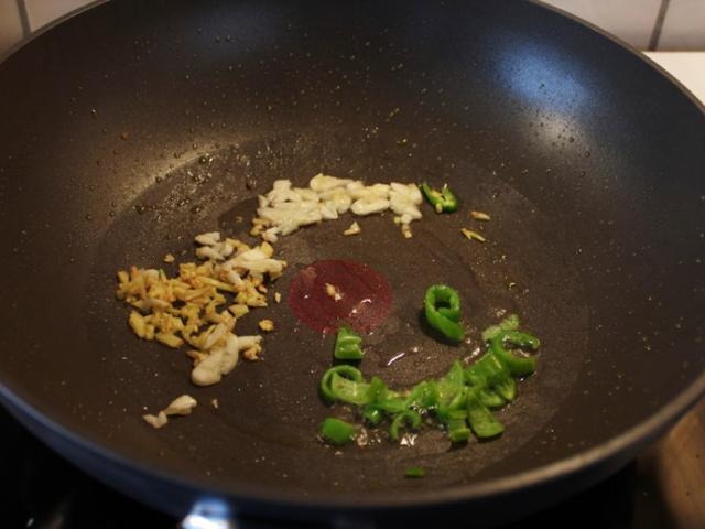 4.原锅再倒少量点油,先下葱姜青辣椒和蒜炒出香味。