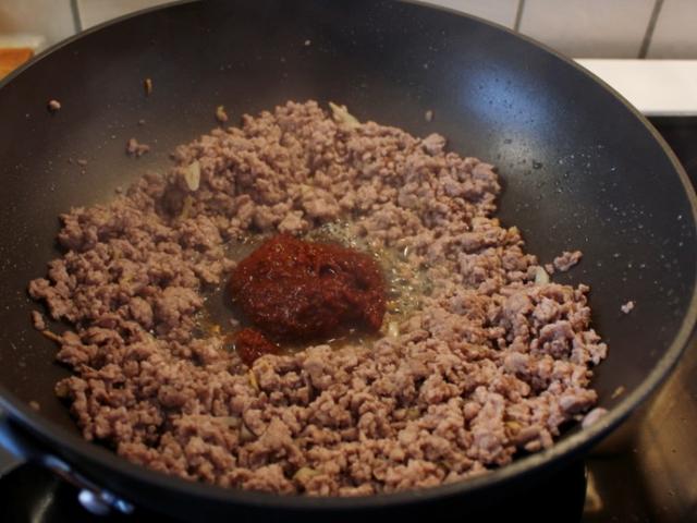 5.当肉末炒断生变色后,拔到旁边,中间下黄豆酱。