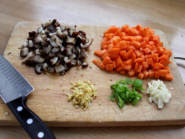 2.胡萝卜和泡发的香菇切小丁,小葱切花,姜切末,青辣椒粗切几刀,蒜拍一下切几刀。
