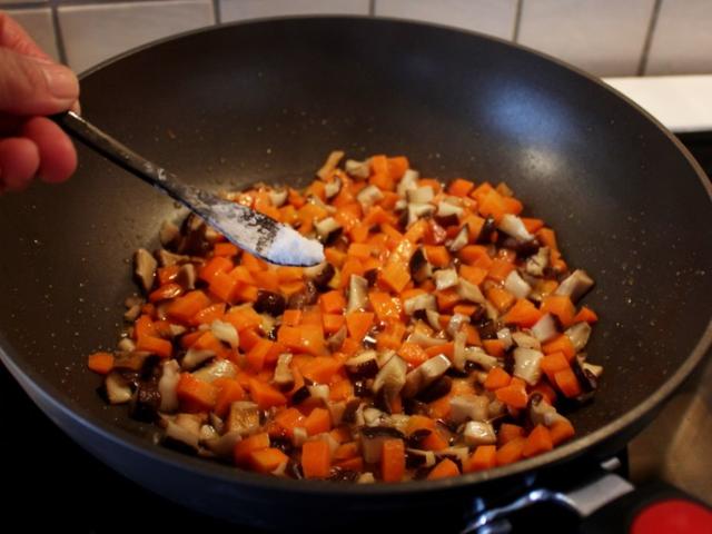 3.锅里倒少量的油,先将胡萝卜和泡发的香菇炒香,加少量的盐调味盛出。