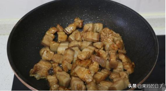 红烧肉多放一些水,让肉充分把油脂煮出来,放一些吸油的果菜,红烧肉就肥而不腻了。