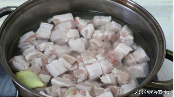 1、带皮五花肉切方块,冷水下锅加入几片姜煮开焯水,捞去浮沫,将五花肉捞出备用。