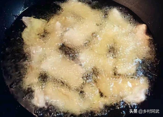 淀粉稍微多一些里面放少许豆油,油温在5成热的时候炸一次,待肉浮起后捞出,等油温再次达到7-8成热下入炸,再捞出,再炸,一共炸三次,这样炸出来的外酥里嫩。