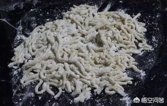 1.鸡蛋加水搅打均匀,加入面粉,揉成面团。面团静置半小时左右,用刀切成薄片,再切成细面条,用面粉将面条播散