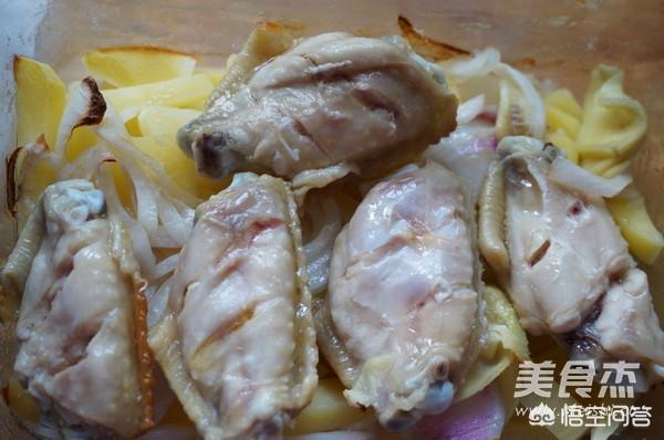 材料:鸡翅5个,洋葱半个,小土豆三只,生姜5片,盐焗鸡粉半包(15g),油适量。