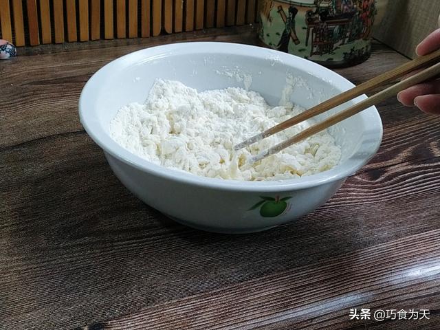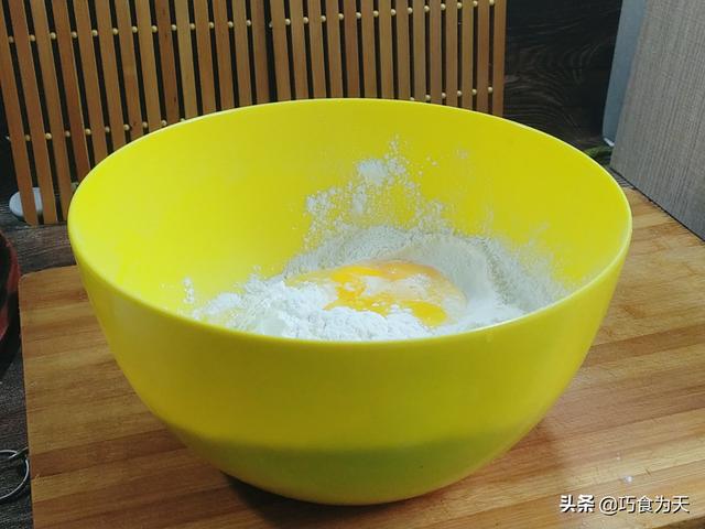 1.200克面粉中打入1个鸡蛋,加入2克的盐和适量的清水,搅拌成面絮状。