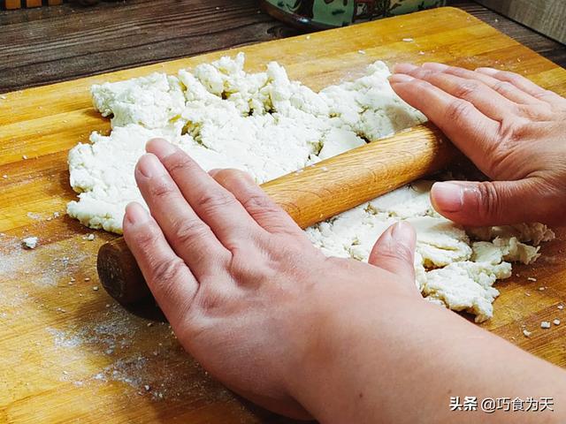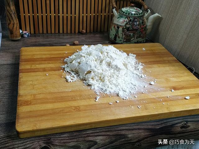 2.待加完水后,就会像上图一样呈豆腐渣状,放在面板上醒面,让面和水充分融合。