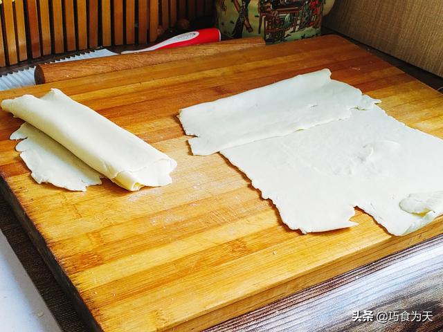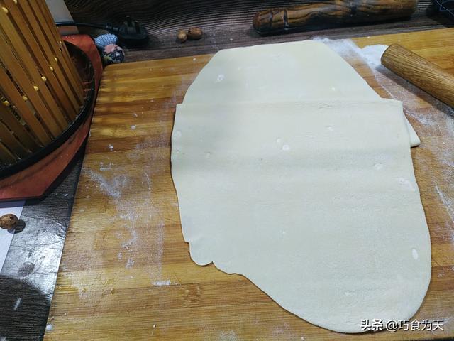 11.面皮两面撒上干面粉抹开像叠扇子一样叠三四层;