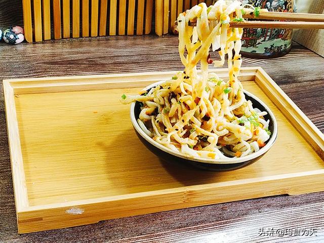 很荣幸能回答这个问题!手擀面,“粗粗的”面条果然“比较筋道”,量也“还可以”。手擀面没想到他家居然还是“家常菜馆的杰出代表”。面条最初只称为“饼”,“水溲饼、煮饼”便是中国面条先河—— “饼,并也,溲面使合并也”(引:刘熙《释名》),其意指用水将面粉和在一起所做出的食品均称之为“饼”;以水煮的面条或面块亦全作“饼”称。 ,是大众的重要主食之一,并深受人们的喜爱。近年来,面条的品种越来越丰富,但家常手擀面却被忽视了。接下来就让我们一起来探讨一下口感筋道的油泼手擀面(油泼面)的做法吧: