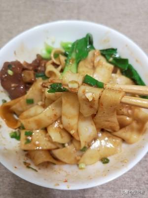 如果做抻面,和面的步骤跟揪面差不多,只是煮之前,先按扁了,然后抓着两头使劲从案板上摔打,直到摔成自己喜欢的宽度和薄厚度,抻面一般是用油泼,做出来是油泼面的效果。