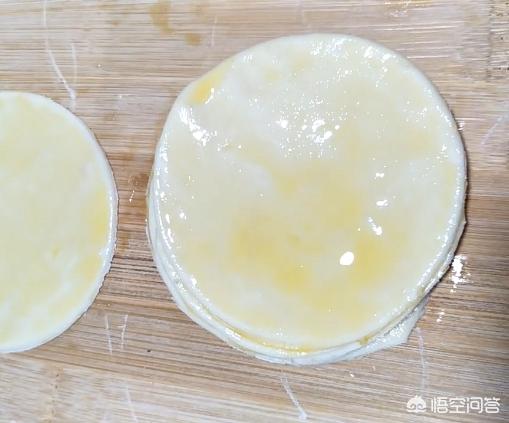 擀好的饺子皮(也可从超市购买)刷上一层油三到五个叠在一起,用擀面杖擀薄。