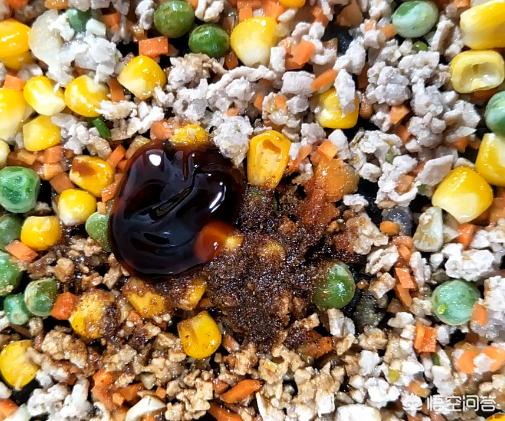 锅中放入切好的肉丁、胡萝卜丁、元葱丁、葱沫、耗油、盐、酱油等爆香炒熟,加入熟玉米粒、青豆等继续炒香出锅。